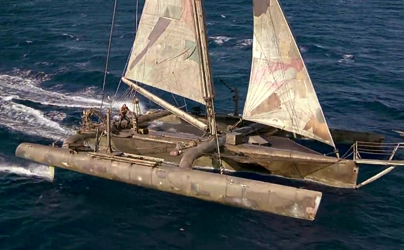 Un mélange de rusticité et de sophistication qui me rappelle étrangement le bateau du film Waterworld. Vous savez le trimaran reformaté pour survivre après la montée des eaux sur notre planète où l’eau douce et la terre sont devenues des denrées précieuses.