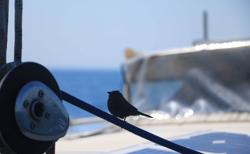 Depuis notre départ, nous sommes accompagnés de quelques compagnons de route. Les oiseaux sont les plus assidus et les plus nombreux, ils occupent en permanence notre sillage dont ils se décrochent parfois pour venir à l’avant du bateau et se laisser rattraper pendant qu’ils exécutent quelques vols planés à faible distance, comme pour regarder ce qu’il se passe à bord. Ni mouettes, ni goélands, ce sont des labbes, des océanites, et des albatros. Ce dernier, emblème des mers du sud, a fini par nous faire l’honneur de sa présence après 7 jours de mer. Depuis il en passe régulièrement à fière allure avec leur envergure de plus de 2m. Les habitants des eaux se montrent moins souvent mais nous avons été accompagné plusieurs jours par des exocets. Quelques un se sont échoués sur le pont. Nous avons aussi eu la surprise d’y ramasser des calamars ! Après un petit temps d’observation nous avons fini par les voir qui sautent à la verticale hors de l’eau comme des fusées. Surement une technique qui tout comme l’exocet lui permet d’échapper à un prédateur. Evidemment retomber sur le pont les mets à la merci des prédateurs que nous sommes. Les calamars sont bon, les exocets sont trop joli, on les relâche…