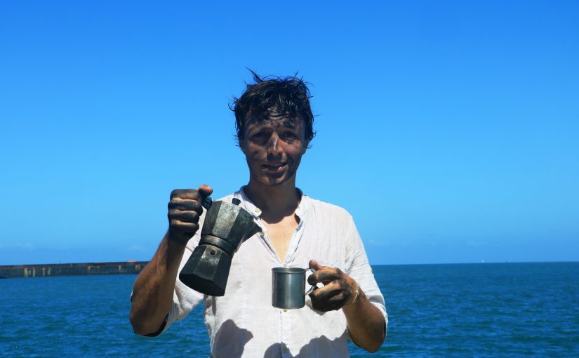 Au Sénégal, grâce à l’association Nebedaye, on s’est mis au charbon vert. Ce charbon est fabriqué localement avec de la paille carbonisée. C’est intéressant parce que ca évite de déforester. Seul défaut : impossible de faire des crèpes, ca ne chauffe pas assez fort. Et puis dès l’escale suivante on ne trouvait plus de ce type de charbon. Depuis le Cap Vert on cuisine donc au charbon de bois. Pas très écolo, assez lent à l’allumage et on se colle du noir partout. Pour faire un café il faut environ 40 minutes. Imaginez la pub où George Clooney arrive après 40 minutes, plein de suie, en toussant, retrouver la belle blonde… Il aurait l’air naze. Il faut qu’on trouve autre chose.