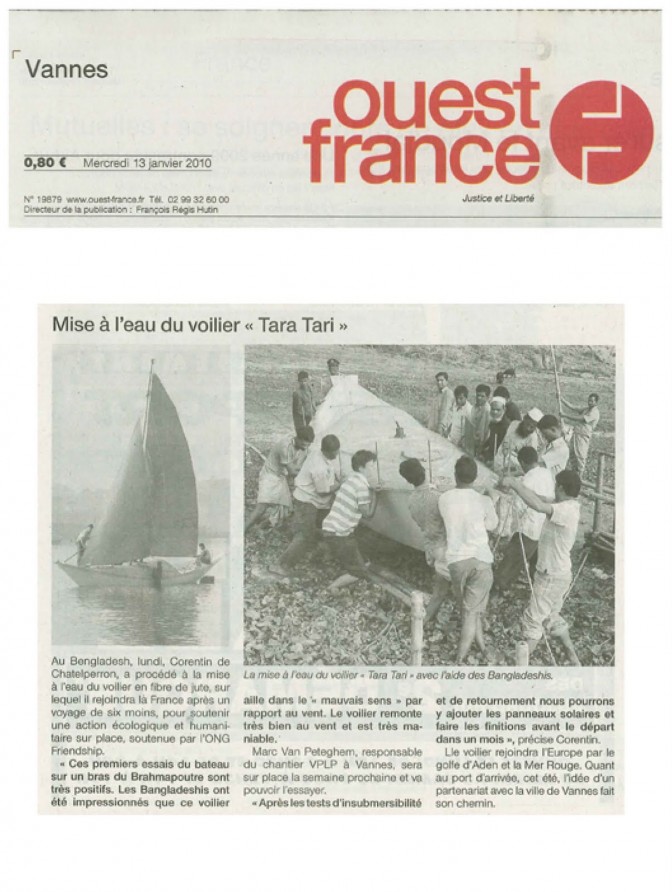 « Ces premiers essais du bateau sur un bras du Brahmapoutre sont très positifs. Les Bangladeshis ont été impressionnés que ce voilier aille dans le « mauvais sens » par rapport au vent. Le voilier remonte très bien au vent et est très maniable.